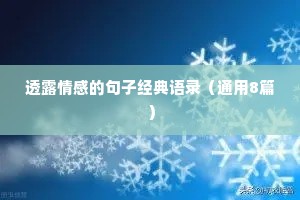 透露情感的经典语录摘要:情感语录集合了多种表达内心感受的经典句子,共涵盖8篇内容。这些语录通过精炼的语言,深刻揭示了人们在爱情、友情、亲情等方面的情感体验,帮助人们更好地理解和表达自己的情感。